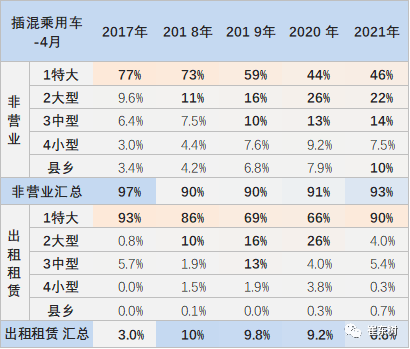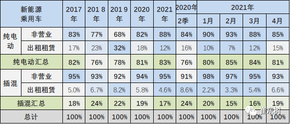 2017-2019年的新能源乘用车的出租租赁类占比逐步提升。纯电动2020年出租租赁的占比相对2019年同期稍有下降。纯电动2021年4月出租租赁的占比在15%的相对低位。