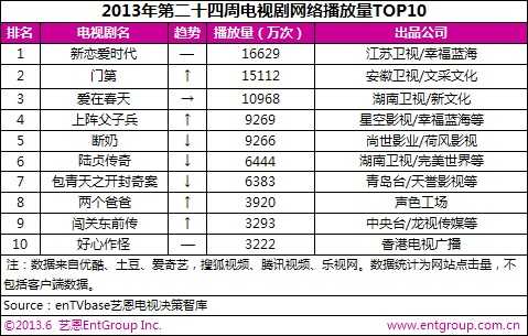据艺恩enTVbase电视决策智库统计,第二十四周网络TOP10电视剧累计播放量8.5亿,环比下降4.3%.《新恋爱时代》首周播出来势汹汹,直冲榜单首位;湖南卫视独播剧《爱在春天》在《门第》和《上阵父子兵》的夹击下表现平稳;本周再有港剧入榜,《好心作怪》排位第十。
