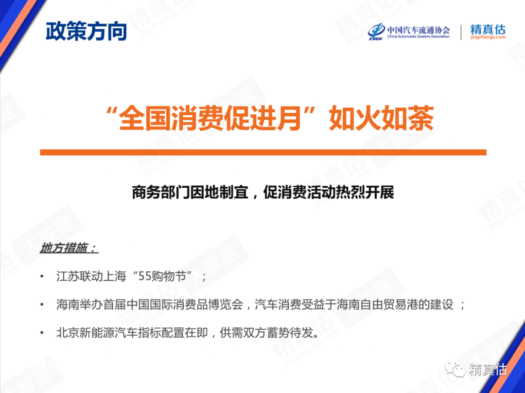 为了实施扩大内需战略,由商务部门组织实施的“全国消费促进月”在五月如期而至。地方各显其能,汽车消费呈现一片火爆。商务部相关负责人提到今年的汽车促消费活动注重城乡兼顾;注重新能源汽车、二手车和后市场;注重一站式服务;注重模式上的“线上线下融合”,“购买使用”,“销售体验融合”。具体到地方,苏州与上海的“55购物节”联动,南京举办国际车博会,都是典型的案例。海南举办了首届消博会,并于本月实现进口 “零关税车辆”。北京的新能源汽车指标已经引起了经销商“抢单大战”。