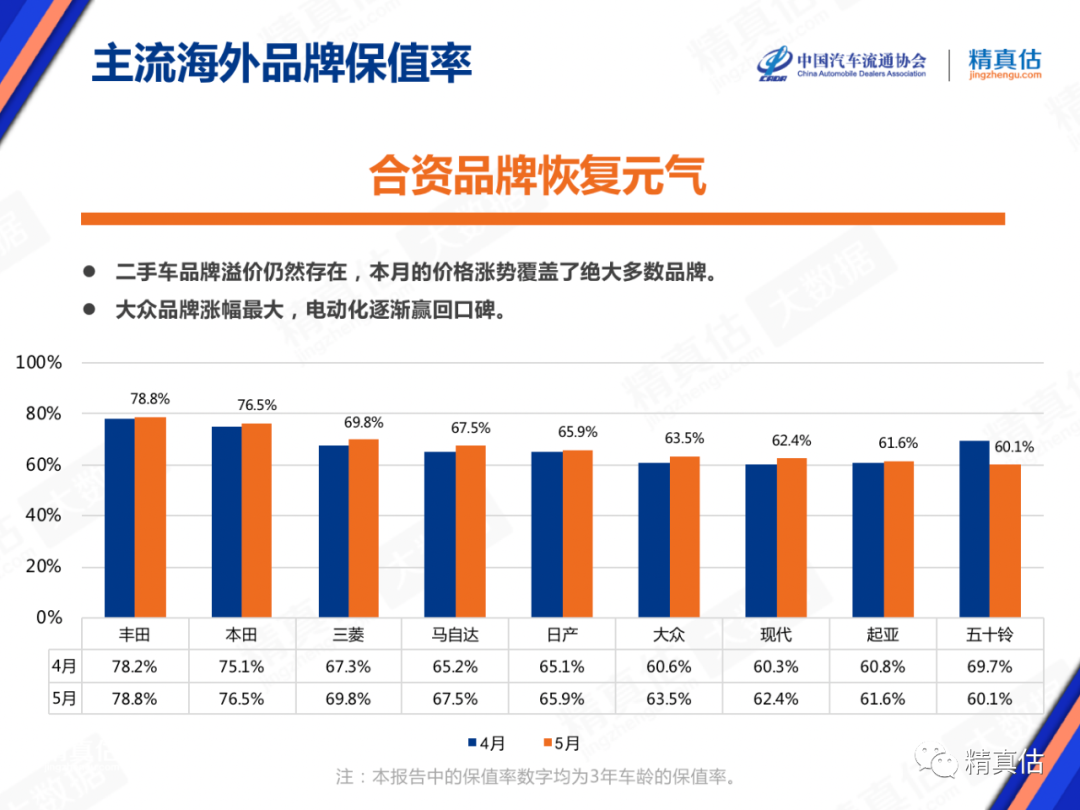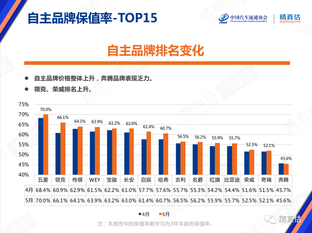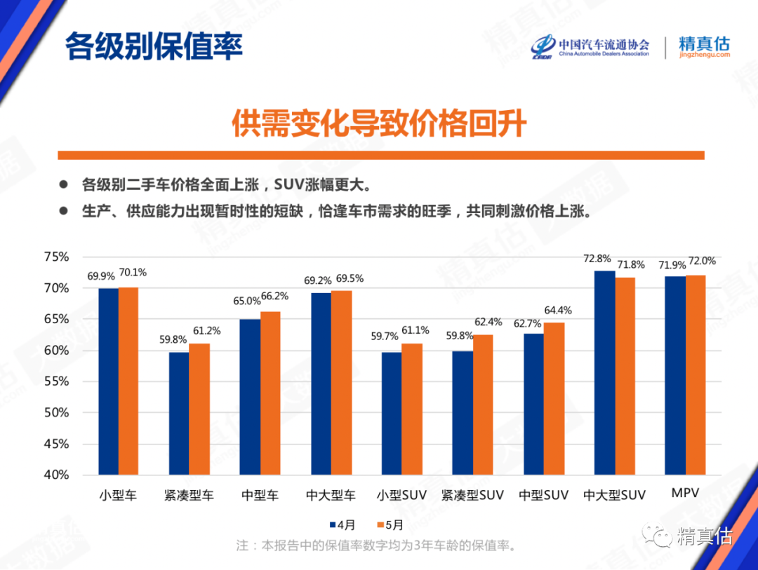中国汽车流通协会和精真估联合发布了《2021年5月中国汽车保值率研究报告》。通过保值率研究旨在反应该品牌的产品力、认知度、美誉度等综合实力,对未来开展回购、置换、租赁、金融、新车定价参考等相关业务提供重要数据参考,从而降低业务风险,提升经营效率。