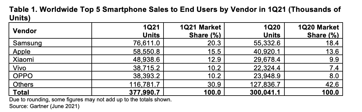 在2020年第四季度,苹果公司凭借其迟来的5G推动力,成功地将其推向了第一,但该公司在次年第一季度下降到第二位,与去年这个时候的位置相同。根据数据,总体而言,其市场份额同比增长约2%,达到15.5。前五名的另外三名由三家中国制造商组成:小米、vivo和OPPO。