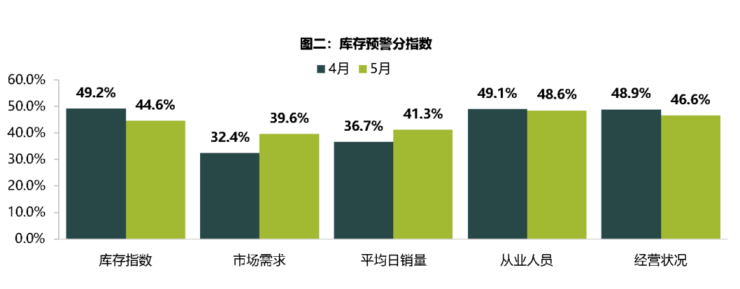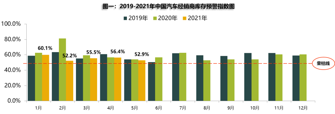 2021年5月31日,中国汽车流通协会发布的最新一期“中国汽车经销商库存预警指数调查”VIA(Vehicle Inventory Alert Index)显示,2021年5月汽车经销商库存预警指数为52.9%,同比、环比双降,分别下降1.3和3.5个百分点,库存预警指数位于荣枯线之上。