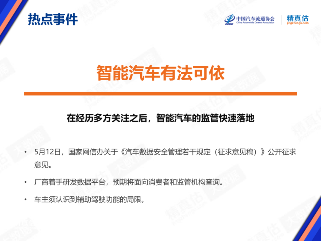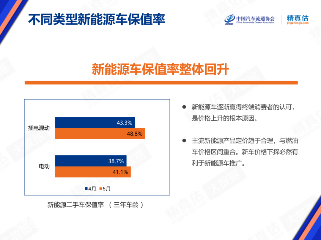 乘联会:2021年5月中国汽车保值率报告 2021年6月1日,中国汽车流通协会和精真估联合发布了《2021年5月中国汽车保值率研究报告》。通过保值率研究旨在反应该品牌的产品力、认知度、美誉度等综合实力,对未来开展回购、置换、租赁、金融、新车定价参考等相关业务提供重要数据参考,从而降低业务风险,提升经营效率。 政策方向——“全国消费促进月”如火如荼 为了实施扩大内需战略,由商务部门组织实施的“全国消费促进月”在五月如期而至。地方各显其能,汽车消费呈现一片火爆。商务部相关负责人提到今年的汽车促消费活动注重城乡兼顾;注重新能源汽车、二手车和后市场;注重一站式服务;注重模式上的“线上线下融合”,“购买使用”,“销售体验融合”。具体到地方,苏州与上海的“55购物节”联动,南京举办国际车博会,都是典型的案例。海南举办了首届消博会,并于本月实现进口 “零关税车辆”。北京的新能源汽车指标已经引起了经销商“抢单大战”。 热点事件——智能汽车有法可依、 智能汽车的发展伴随着大数据的采集,《规定》指出,智能汽车采集数据也在《中华人民共和国网络安全法》管辖范畴之内。该规定的发布,对于行业、企业和消费者来说,将是多方受益的结果。 线上车源量变化——二手车源恢复增长 去年2020年5月正值疫情后的经济恢复期,消费活跃的盛况历历在目,今年数据又有进一步的提升。部分媒体认为5月可能出现同比下降的担忧已经可以打消了。“全国消费促进月”的效果可以说立竿见影。 各级别保值率——供需变化导致价格回升 二手车价格仍然与新车挂钩。生产资料价格的变动多数情况下不会传递到消费者,但今年已经积累了“缺芯”、“缺钢”、“缺铜”多项不利因素,多重叠加之下,厂商经销商难以全部承担,因此市场上看到了一部分新车涨价。二手车价格与之关联。 需求方面,在一线城市限购有所调整,释放了一部分需求。另外从宏观层面看,“十四五”开局之年,农村消费能力是非常可观的,汽车产品自然是大宗消费的主力产品。 新能源车市场变化——换电模式占上“风口” 长期以来,基础设施不足是制约新能源汽车消费的痛点,也是部分消费者在燃油车和电动车之间左右为难的原因之一。解决这一问题需要各方协力,例如各厂商生产的车型要符合一定的通用标准;能源部门需要配合提供必要的电力保障;最后一步是实现充换电站的商业化运营,依靠市场机制来最终实现良性循环。其中换电站的试点应首先在电动车保有量高的地区开展。 不同类型新能源车保值率——新能源车保值率整体回升 纯电动车型三年车龄保值率超过40%已经达到近期较高水平,价格“曲线”上升的起点预计将在5-6月达成。尤其在北京地区纯电动车的接受度显著提高。 更多阅读:中国汽车流通协会:2021年5月中国汽车保值率报告中国汽车流通协会:2022年4月中国汽车保值率报告中国汽车流通协会:2022年10月中国汽车保值率报告中国汽车流通协会:2021年11月中国汽车保值率报告中国汽车流通协会:2022年4月中国汽车保值率报告中国汽车流通协会:2021年8月中国汽车保值率报告中国汽车流通协会:2024年度上半年中国汽车保值率报告中国汽车流通协会:2020年3月中国汽车保值率报告中国汽车流通协会:2022年11月中国汽车保值率报告中国汽车流通协会:2023年4月中国汽车保值率报告中国汽车流通协会:2019年9月份中国汽车保值率报告中国汽车流通协会:2019年3月中国汽车保值率报告中国汽车流通协会:2021年7月中国汽车保值率报告中国汽车流通协会:2019年12月中国汽车保值率中国汽车流通协会:2023年7月中国汽车保值率报告