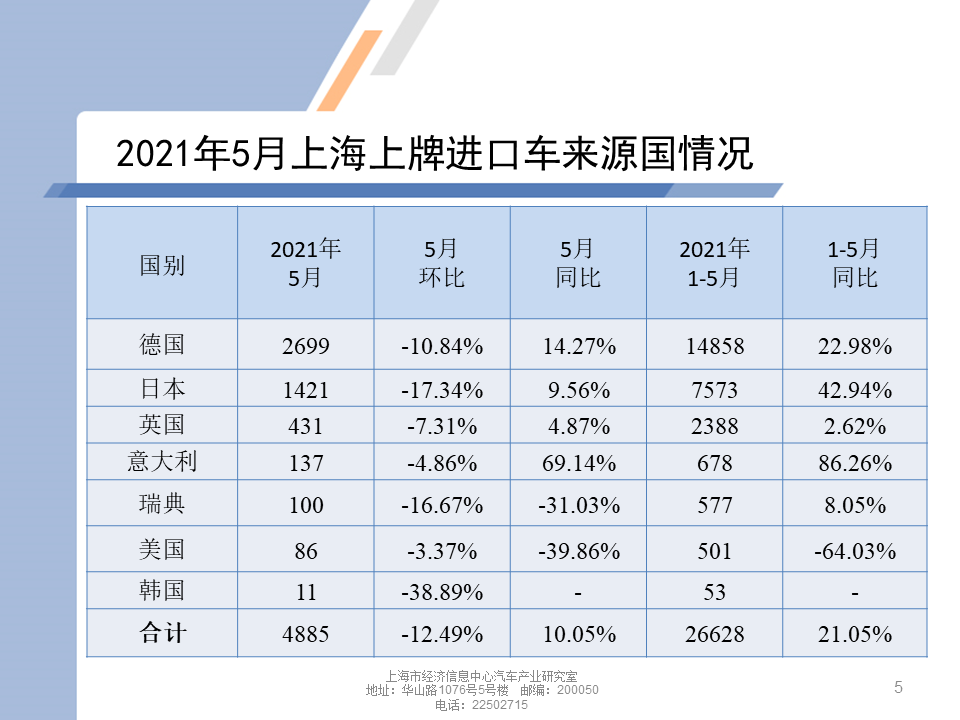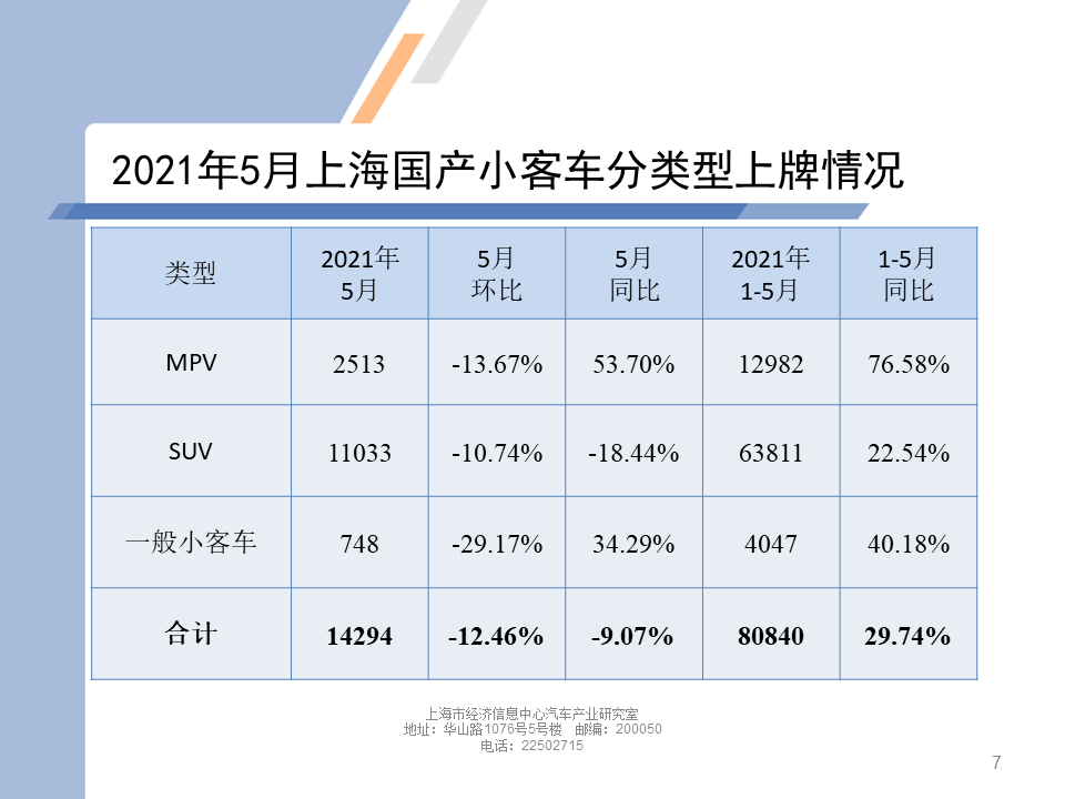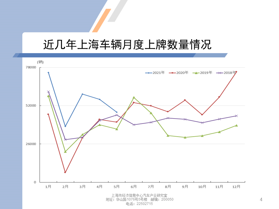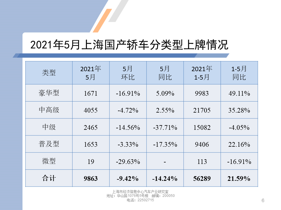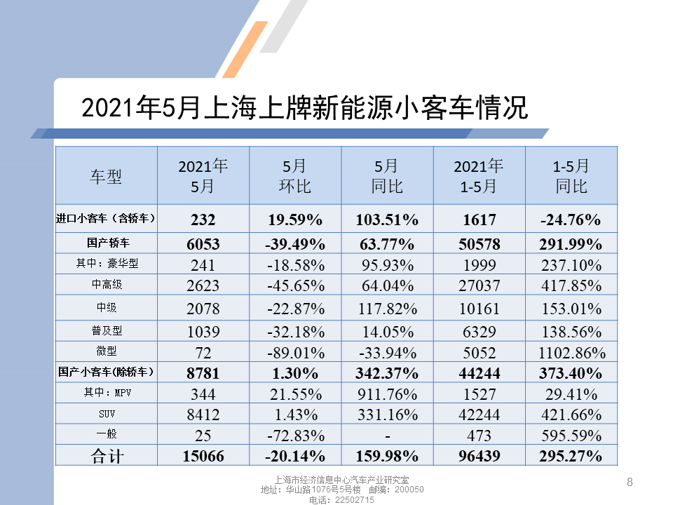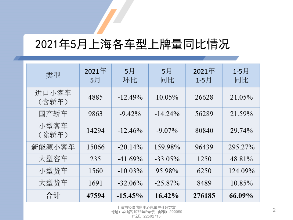 乘联会:2021年5月上海汽车市场上牌情况 2021年5月上海总体上牌数是47,594。较上月环比下降15.45%,同比增长16.42%。 1-5月累计上牌数276,185,累计同比增长66.09%。 5月具体分类型的上牌情况是:进口小客车(含轿车)4,885;国产轿车9,863;小型客车(除轿车)14,294;新能源小客车15,066;大型客车235;小型、大型货车分别是1,560和1,691。 更多阅读:上海经济信息中心:2024年4月上海汽车市场上牌情况乘联会:2021年11月上海汽车市场上牌情况上海经济信息中心:2023年6月上海汽车市场上牌情况上海经济信息中心:2023年4月上海汽车市场上牌情况上海经济信息中心:2023年1月上海汽车市场上牌情况乘联会:2021年7月上海汽车市场上牌情况乘联会:2024年1-5月插混车销量暴增70.1% 增速是纯电车4倍乘联会:2025年3月乘用车市场零售量达194.0万辆 同比增长14.4%乘联会:预计2025年4月狭义乘用车零售市场能达到175万辆左右 同比增长14.4%乘联会:2025年6月新能源乘用车出口19.8万辆,同比激增116.6%乘联会:2025年前9月中国新能源汽车均价16万元上海经济信息中心:2022年7月上海汽车市场上牌情况中国汽车流通协会:2021年10月上海汽车市场上牌情况中国汽车流通协会:2020年8月上海汽车市场上牌情况上海经济信息中心:2021年10月上海汽车市场上牌情况