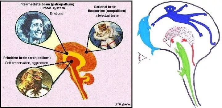 比如,神经科学家Paul Maclean曾在上个世纪60年代提出的三脑理论。尽管现在看来并不完美,但已经足够有启发。
