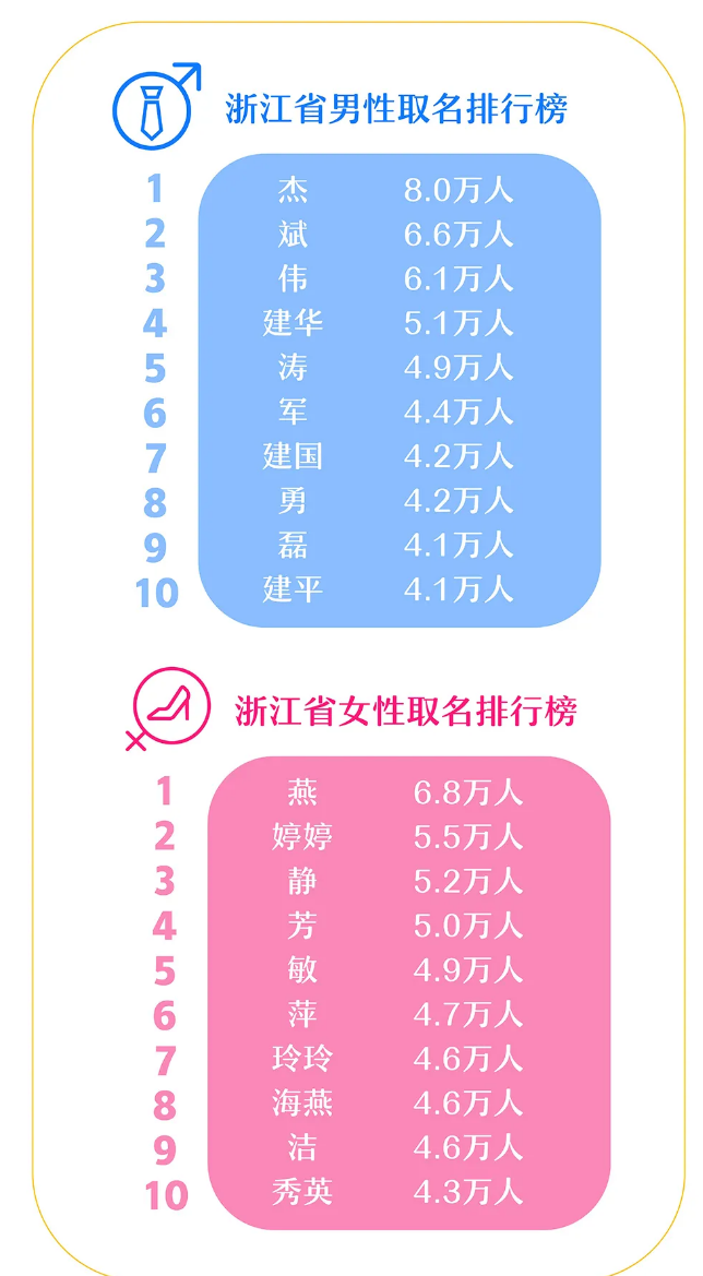 名字,蕴含了人们对幸福生活朴实的追求,对子女真挚的祝福和殷切的希望,同时也记录了审美的时代变迁。今日,#浙江近十年新生儿爆款名字#登上微博热搜。据媒体报道,@浙江公安对全省人口统计分析发现,王芳是浙江重名最多的名字,共8704人。