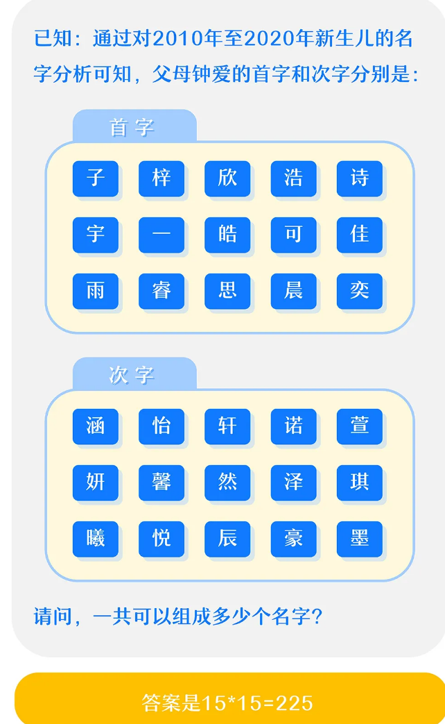 通过对2010年至2020年新生儿的名字分析可知,父母钟爱的首次和次字分别是:首字有子、梓、欣、浩、诗等;次字有涵、怡、轩、诺、萱等。也就是说首字+次字可以组成225个名字。