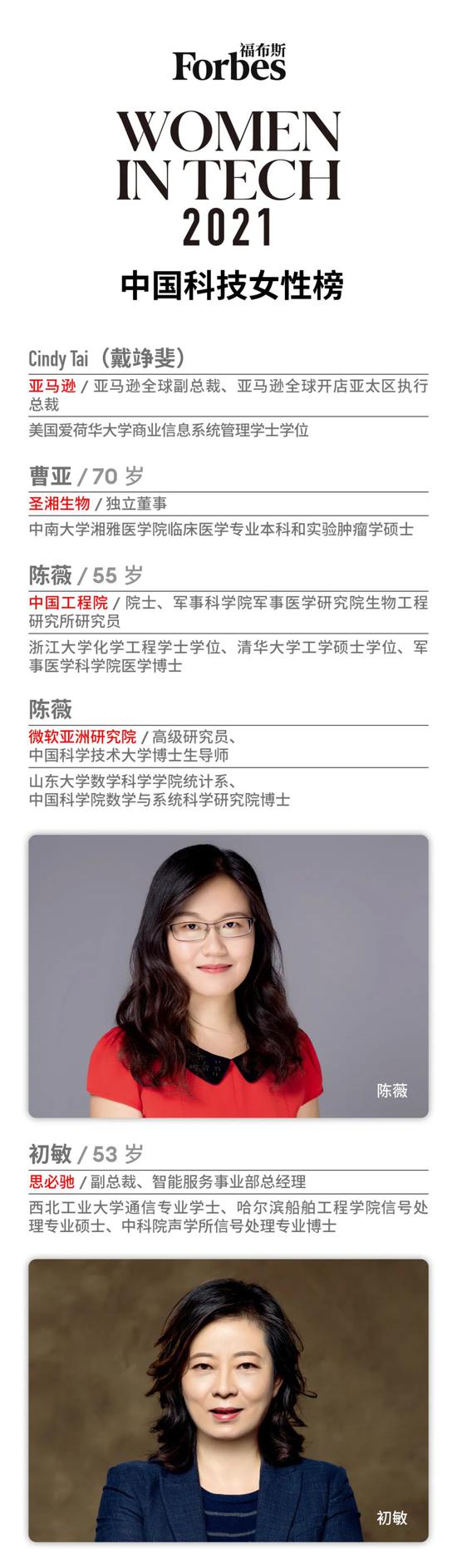 2021 年,福布斯中国连续第三年推出 “中国科技女性榜”,旨在通过调研和评估,寻找中国科技女性中的优秀标杆人物,在展示她们取得非凡成就的同时,也诠释女性的多元化、包容性以及对科技创新性、可持续性和经济增长带来的巨大推动力和影响力。