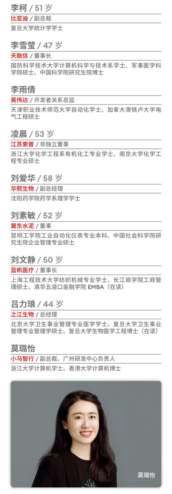 今年,仍有50名中国顶尖科技女性登上该榜单,她们不仅具有强大的企业家精神和深厚的科技背景,还善于运用女性独特的细腻和坚韧,给科技界带来了别样的风景和创新视角。