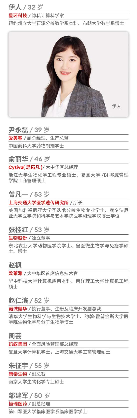 数据显示,此次上榜的科技女性平均年龄为38.38岁,年龄最大的是79岁,年龄最小的是32岁;教育背景方面,学士学位占比26%,硕士学位为40%,博士学位为34%,海外求学经历比例达24%;行业方面,医药行业和科技行业最多,占比超过60%;公司方面,国内企业占80%,其中20%为创业公司,而外企为20%,74%为上市公司。