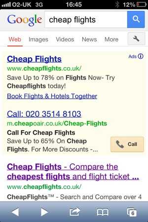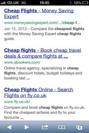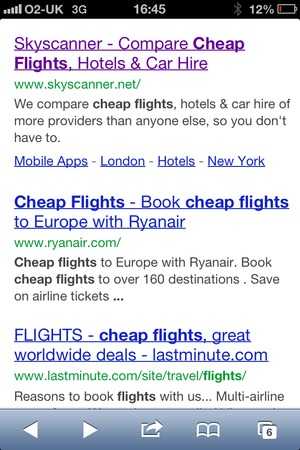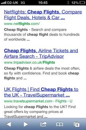 为此 Econsultancy分析了英国航空网站的移动站点情况,下面是输入cheap flights的搜索结果页: