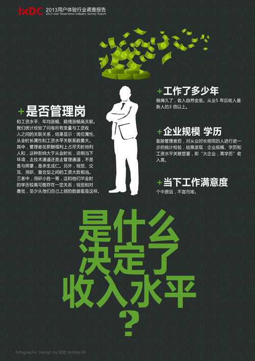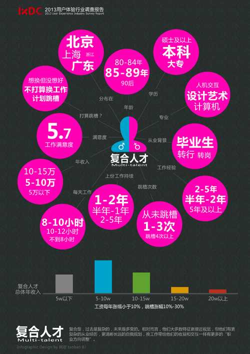 由IxDC主办,腾讯MXD、UIRSS协办的“2013年中国用户体验行业调研”报告出炉,报告反应了用户体验行业的市场和趋势,以及从业者的生存状态。调查显示视觉设计师对工作满意度最低,管理者对工作满意度最高。与此同时,岗位属性、从业时长属性更大关联了收入水平。