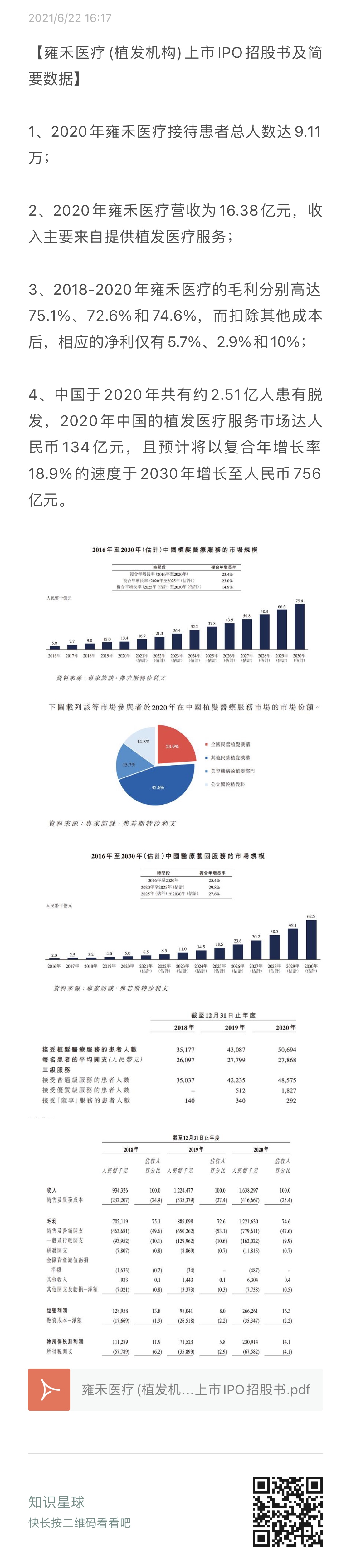 2、2020年雍禾医疗营收为16.38亿元,收入主要来自提供植发医疗服务;