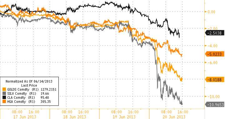 美联储伯南克周三的言论继续发酵。伯南克周三说,如果经济足够强劲,美联储将在今年晚些时候开始缩减每月850亿美元的QE规模,并可能在明年中期前后结束QE。中国市场也令人担忧,周三中国银行间隔夜拆息大幅攀升,七天期回购利率升至至少2006年以来最高。此外,6月中国汇丰制造业PMI初值降至九个月低点。