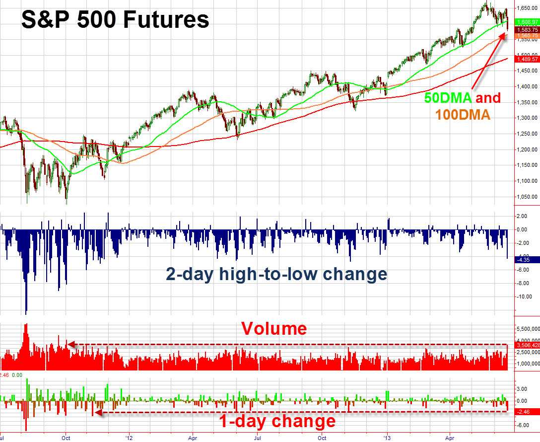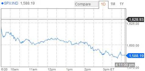 标普500指数跌2.5%,创下2011年11月以来最大单日跌幅。标普500指数收于50日移动均线之下,仅为年内第二次,且为5月2日来首次收于1,600点下方。