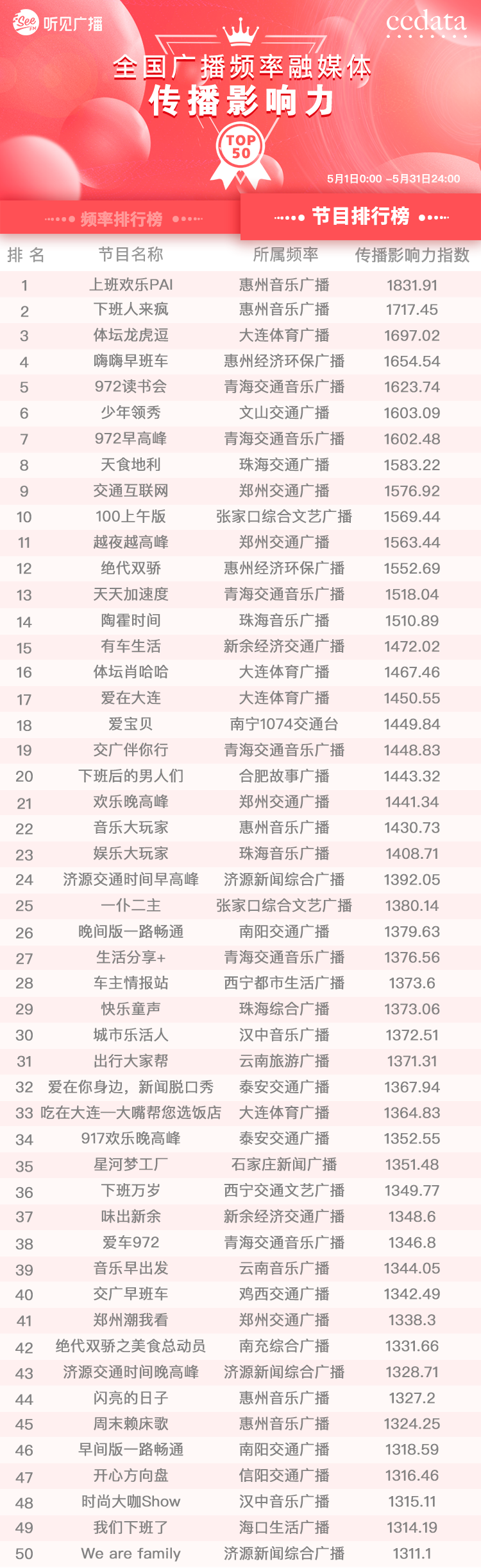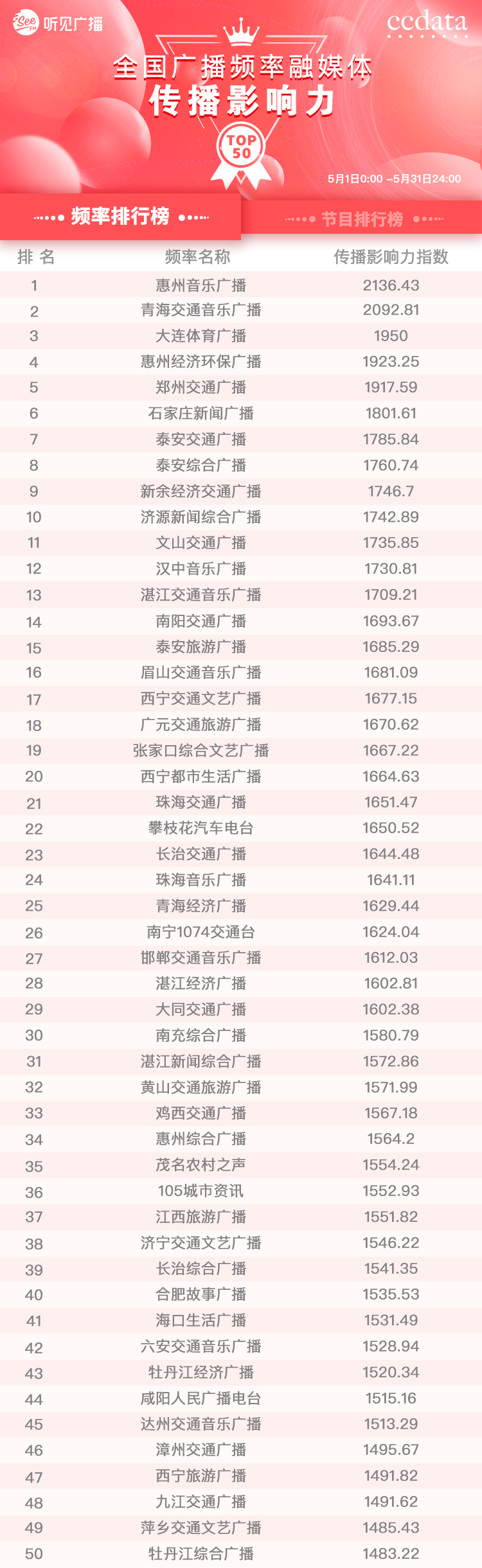 CCData&听见广播:2021年5月全国广播频率融媒体传播影响力榜单 近日, CCData与听见广播联合发布了2021年听见广播“5月全国广播频率融媒体传播影响力榜单”。本届榜单是通过CCData融媒体传播影响力模型对听见广播APP上337个城市,500+广播电台频率的PV、UV、粉丝量等影响力指标进行综合评测最终得出。 以下是2021年5月全国广播频率融媒体频率传播影响力TOP50。 以下是2021年5月全国广播频率融媒体节目传播影响力TOP50。 更多阅读:CCData:2022年9月广电主流媒体融合传播影响力月榜中科网联CCData:2022年8月全国网收视月度盘点CCData:2021年家庭智能投影设备市场分析中科网联CCData:2023年4月全国网收视月度盘点CCData:触媒消费白皮书解“年轻尾款人”CCFA:2019年中国超市百强Demand Gen :制造商将数字转换扩展到销售和营销报告前程无忧:2021年Q1集成电路/半导体市场供需报告数字之旅的时代启幕——空间计算乐普医疗新冠病毒抗体胶体金法检测试剂盒、红外测温仪等产品已供往数十国家中电联:2021中国电力行业年度发展科技照亮银发生活 创新编织幸福晚年StarRocks 优化实践:揭秘毫秒级实时分析的三大核心技术阿里云领投,硅基流动完成数亿元A轮融资柳叶刀机器人完成数千万元A+轮融资 悦湖基金投资