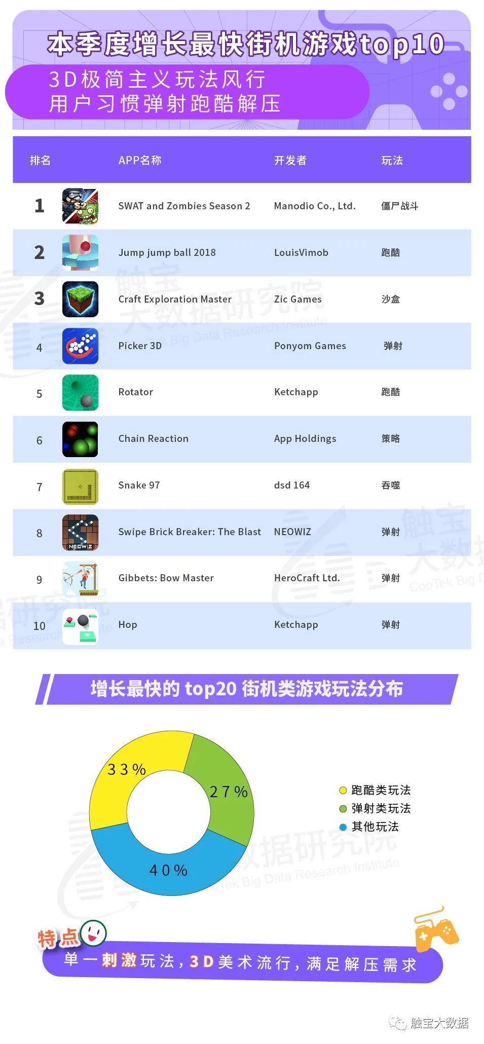 轻型游戏是新手玩家最易接触到的门类,凭借着自己的易上手、便于操作、填充碎片时间等特点让玩家养成游戏习惯,街机类游戏正是通过线条简单,满足解压需求和填充碎片时间的工具需求快速获客。但随着同质化玩法的增加,更多新游戏通过美术、玩法与用户群体等方面的开拓成为爆款。因此触宝(NYSE:CTK)大数据研究院针对头部街机游戏进行研究,展示近段时间街机游戏的玩法、增长、与变现等情况。