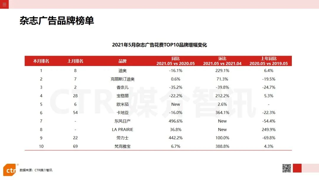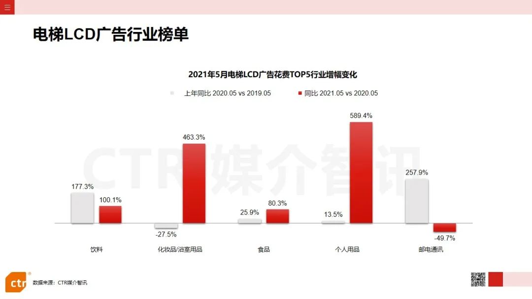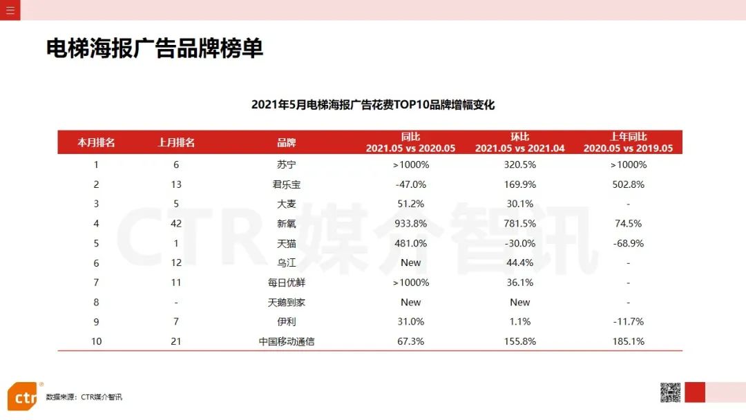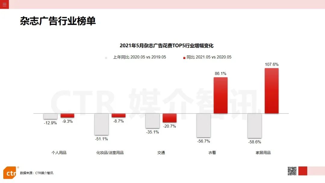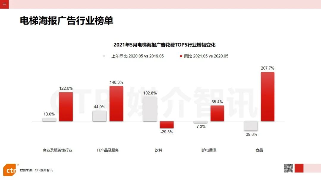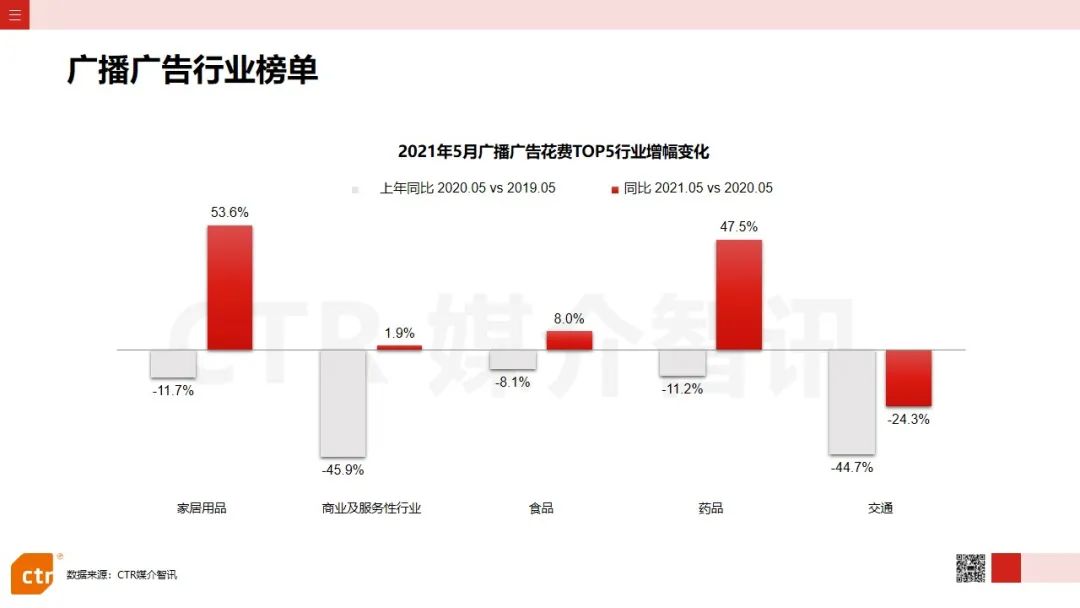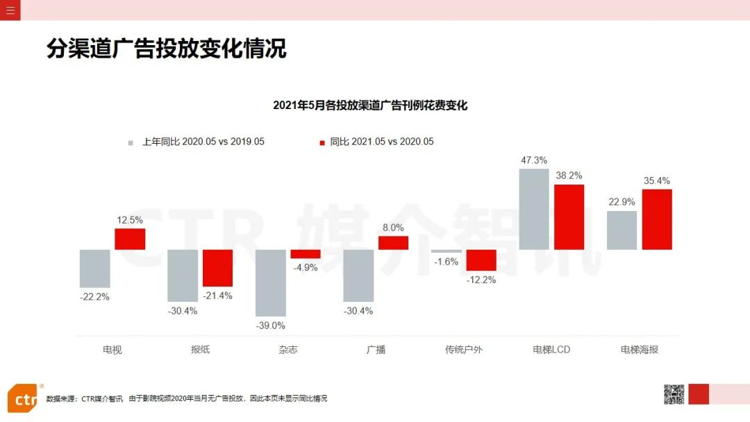 根据CTR媒介智讯的数据显示,2021年5月广告市场花费同比增长28.9%,环比增长14.4%。电视、广播、电梯广告刊例花费同比持续上涨,传统户外广告花费进一步缩减,多个广告牌类型如候车亭、看板、灯箱等广告同比减少明显。