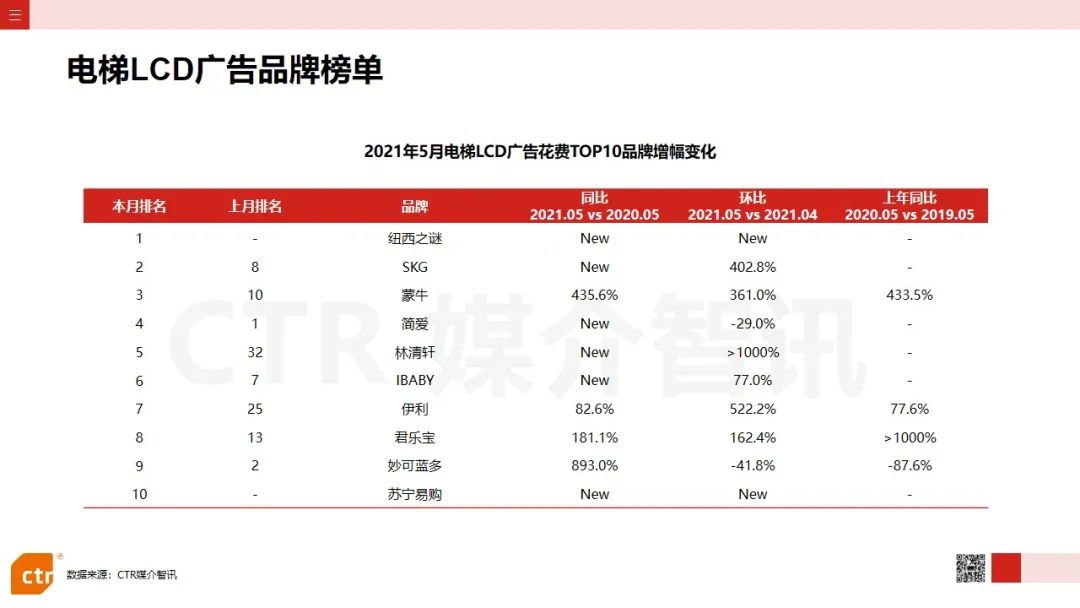 2021年5月食品、化妆品浴室用品行业在多个广告渠道增加了投放量。食品行业在电视、广播、电梯LCD和电梯海报渠道的投放量较大。其在电视广告的刊例花费同比上涨17.2%,保健食品、零食糖果、食用油、调味品、奶类产品等多个品类同比增长,婴幼儿食品的电视广告增长翻倍,一些蔬果泥、儿童辅食等产品投放活跃。食品行业在广播广告的投放增长主要源于保健食品、肉类、糕点饼干等的增投,燕之屋、小仙炖、斯利安、首农、迪巧等品牌投放量大。电梯广告中,奶类产品、冰雪食品、糕点饼干、食用油几个食品行业的大品类投放比较密集,涉及到的品牌主要是妙可蓝多、乌江、迪巧、伊利等。