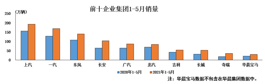 中汽协会:2021年1-5月汽车销量排名前十位的企业集团销量合计为944.5万辆 2021年1-5月,汽车销量排名前十位的企业集团销量合计为944.5万辆,占汽车销售总量的86.8%,同比增长35.0%,低于上年同期1.1个百分点。十家企业销量继续保持较快增长,其中奇瑞、长城和长安增速依然最为明显。 更多阅读:中国汽车工业协会:2022年1-8月汽车销量排名前十位的企业(集团)共销售1453.9万辆中国汽车工业协会:2022年第一季度汽车销量排名前十位的企业(集团)共销售558.6万辆中汽协:2021年1-7月汽车销量排名前十企业简析中汽协会:2020年前十家汽车生产企业出口量排名中汽协会:2020年前十家中国品牌汽车生产企业销量排名中汽协会:2020年前十家客车生产企业销量排名中汽协会:2020年12月汽车商品进出口情况简析中汽协会:2021年1-5月前十家汽车生产企业出口量排名中汽协会:2021年1-5月汽车商品进口金额排名前十位国家情况简析中汽协会:2022年1-2月汽车制造业固定资产投资同比呈较快增长中汽协会:2020年1-11月汽车制造业累计实现利润4781.1亿元,同比增长7.2%中汽协会:主要汽车企业2022年8月份销量数据中汽协会:2021年1-5月汽车制造业营业收入情况中汽协会:2022年1月汽车行业运行监测中汽协会:2020年1-11月汽车制造业完成营业收入72352亿元 同比增长2.9%