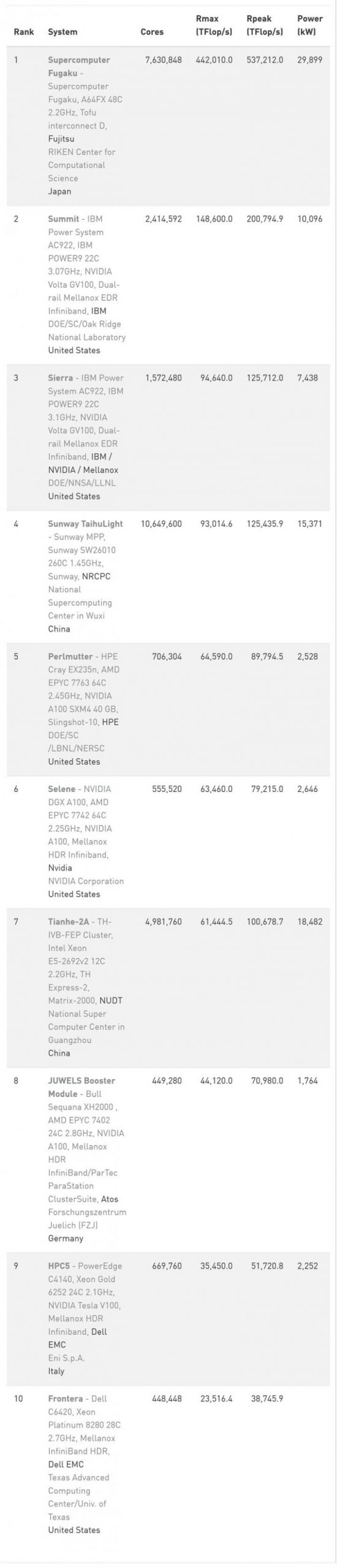 TOP500指出,虽然这次的榜单没有什么变化,但它确实说 AMD 处理器似乎被更多地使用。随着冠状病毒急剧影响世界,它可能已经推迟了超级计算机的工作,这将解释名单上缺少超大规模计算机。希望在今年年底前我们终于能得到一些。