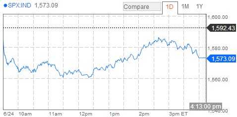标普500指数收跌19.34点,或1.21%,至1,573.09点,此为4月22日来最低收盘价。道琼斯指数收跌139.84点,或0.94%,至14,659.56点。纳斯达克指数跌36.49点,或1.09%,至3,320.76点。