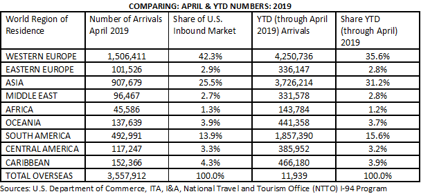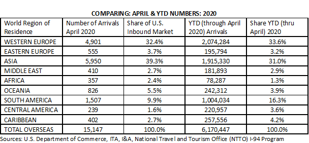 ⦁ 西欧和亚洲的结合。2019年4月这两个地区占美国海外入境游客的2/3和占2020年美国海外入境游客的近72%。今年4月,这两个地区向美国输送的海外游客仅占22%。