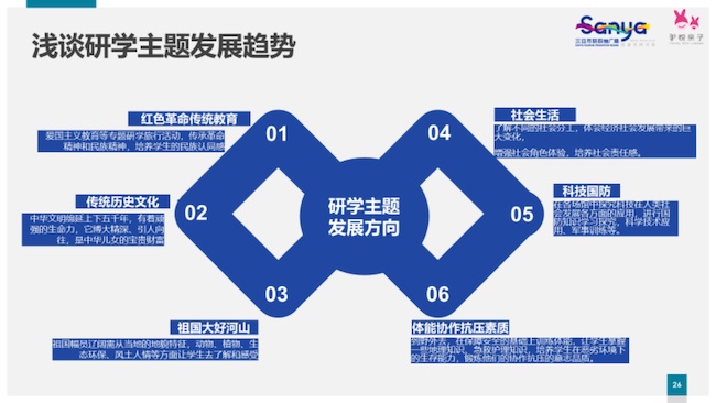 《报告》还表示,研学主题向红色革命传统教育、传统历史文化、祖国大好河山、社会生活、科技国防、体能协作康业素质方向发展。如三亚拥有丰富的游研学资源,充分利用当地特有的自然优势,打造开展亲子活动,有雨林溯溪、野外生存、野外露营,海上活动、海洋探索、民族风情、人文历史等特色活动。作为国内知名旅游城市,三亚多年积累已成功构建以“酒店+机票” 为核心的家庭亲子度假热销产品已超300+。驴妈妈旅游网调查显示,选择三亚亲子度假的家庭占出行家庭总数12.65%。