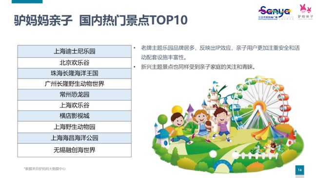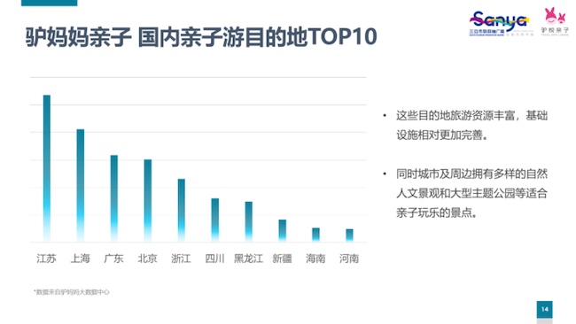 《报告》还发布了多款亲子家庭最爱榜单,总结了国内亲子游目的地TOP10,江苏、上海、广东、北京、浙江、四川、黑龙江、新疆、海南、河南纷纷登上排行榜,拥有自然人文景观和大型主题乐园的城市更受欢迎。