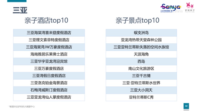 在最受亲子喜欢的度假酒店榜单中,上海玩具总动员酒店、广州长隆熊猫酒店、江苏常州环球恐龙城维景国际大酒店、浙江临安湍口众安氡温泉度假酒店、海南三亚湾国光豪生度假酒店、海南三亚理文索菲特度假酒店、千岛湖绿城度假酒店、灵山小镇拈花湾、横店冰之梦奇幻主题酒店位列前十。这些酒店均拥有完善的亲子配套设施;毗邻知名亲子景点或景区;周围自然风光良好;交通便利等因素,得到更多家庭欢迎。