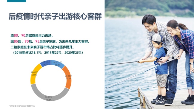 《报告》显示,二孩家庭出游逐年上涨,2021年上半年占比增加到25%,未来将成为亲子旅游市场的消费主力。年龄分布方面,31岁-35岁的亲子游客占39.8%,24-30岁以及36-40岁游客分别占20.1%、18.9%,85后、90后、95后占比逐年增加,成为亲子出游核心客群。