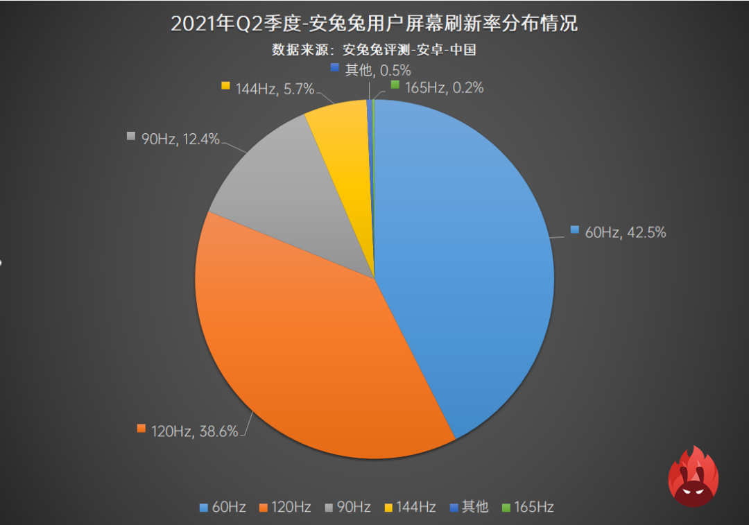 近日,安兔兔公布的用户偏好统计显示,60Hz的安卓手机市场份额已经跌至42.5%,120Hz机型爆发,大有超越60Hz之势。