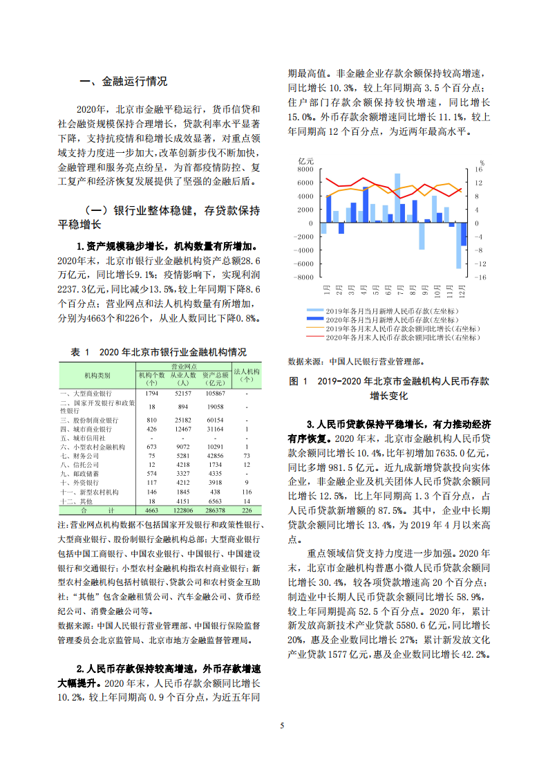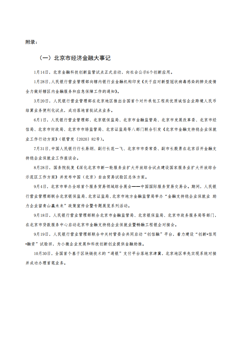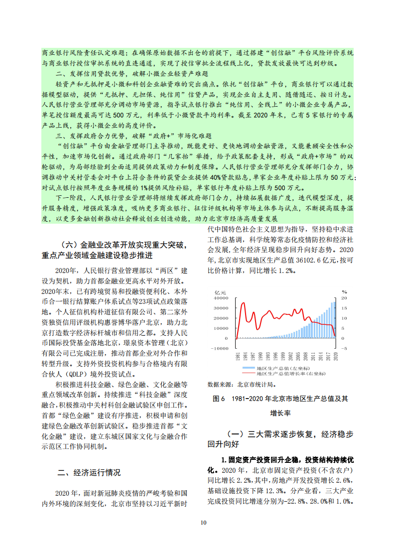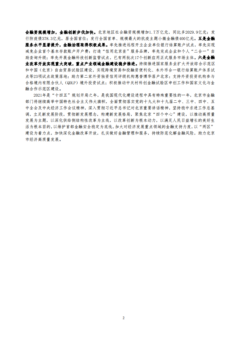 2020年,面对突如其来的疫情冲击和多重风险挑战,北京市坚决贯彻党中央、 国务院决策部署,科学统筹推进常态化疫情防控和经济社会发展,扎实做好“六 稳”工作,全面落实“六保”任务,全力推动复工复产达产,北京市经济呈现稳 步回升向好态势,全年实现地区生产总值36102.6亿元,同比增长1.2%。北京市 金融运行保持平稳,金融支持疫情防控、复工复产、稳企业保就业工作高效开展, 改革创新步伐不断加快,金融管理和服务亮点纷呈,全年社会融资规模增加1.7 万亿元, 金融业向实体经济累计让利约1100亿元,为夺取疫情防控和经济社会发 展“双战双胜”提供了坚强的金融后盾。