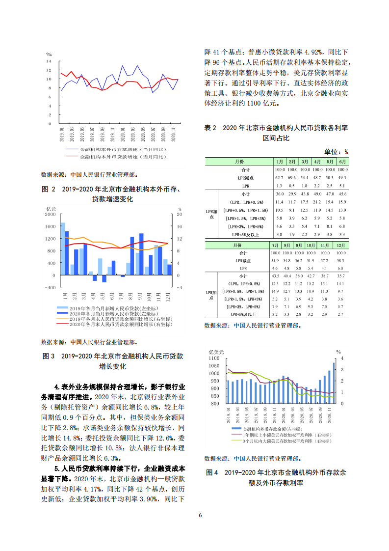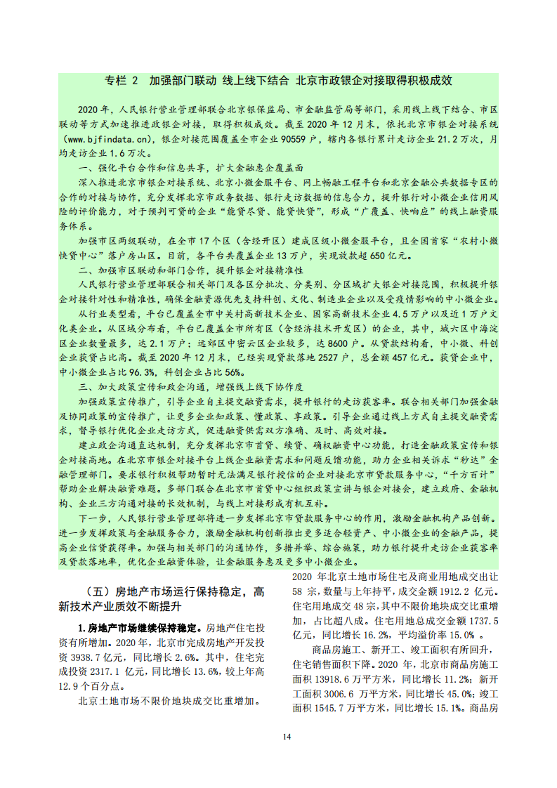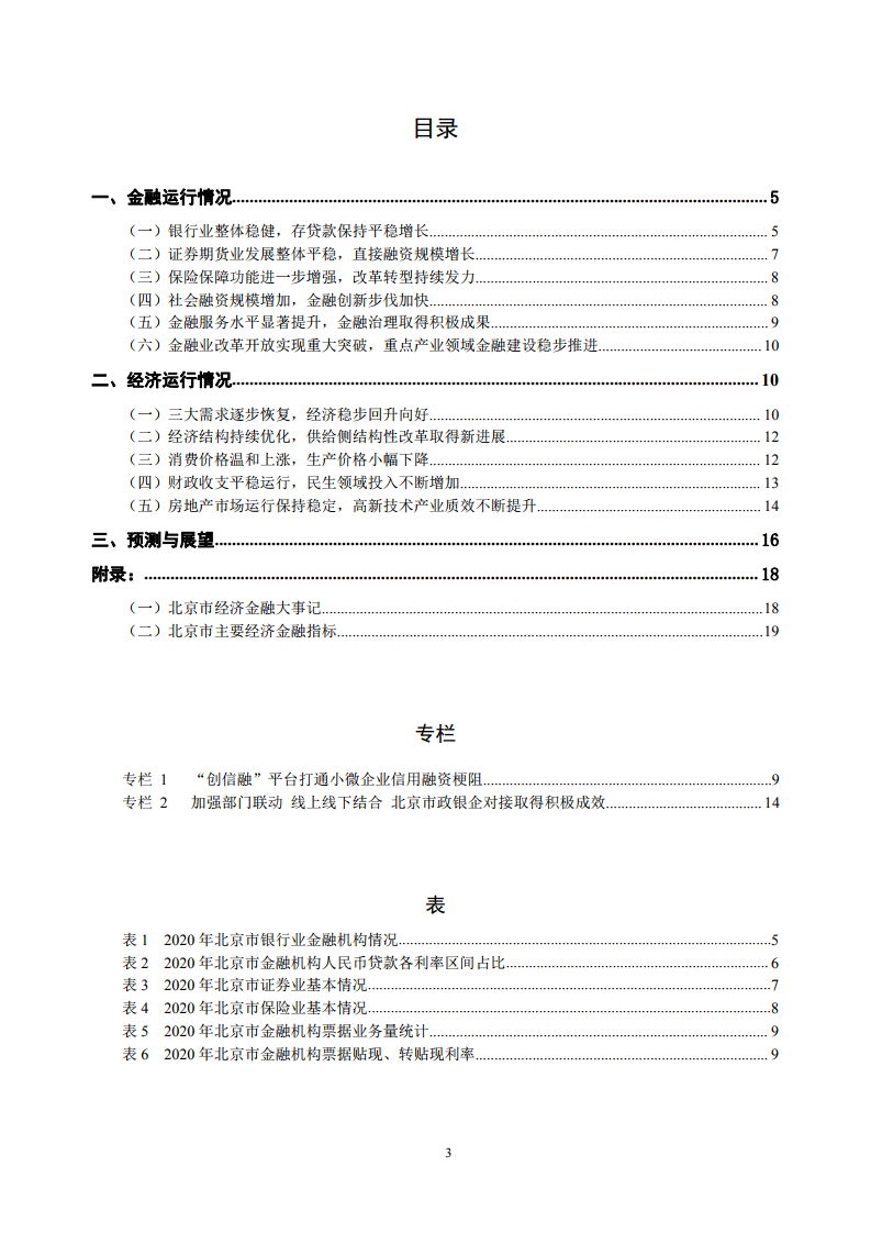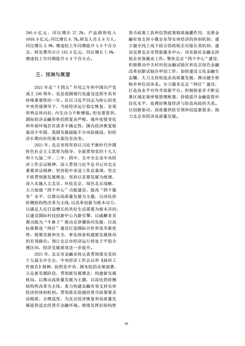 2020年,面对突如其来的疫情冲击和多重风险挑战,北京市坚决贯彻党中央、 国务院决策部署,科学统筹推进常态化疫情防控和经济社会发展,扎实做好“六 稳”工作,全面落实“六保”任务,全力推动复工复产达产,北京市经济呈现稳 步回升向好态势,全年实现地区生产总值36102.6亿元,同比增长1.2%。北京市 金融运行保持平稳,金融支持疫情防控、复工复产、稳企业保就业工作高效开展, 改革创新步伐不断加快,金融管理和服务亮点纷呈,全年社会融资规模增加1.7 万亿元, 金融业向实体经济累计让利约1100亿元,为夺取疫情防控和经济社会发 展“双战双胜”提供了坚强的金融后盾。
