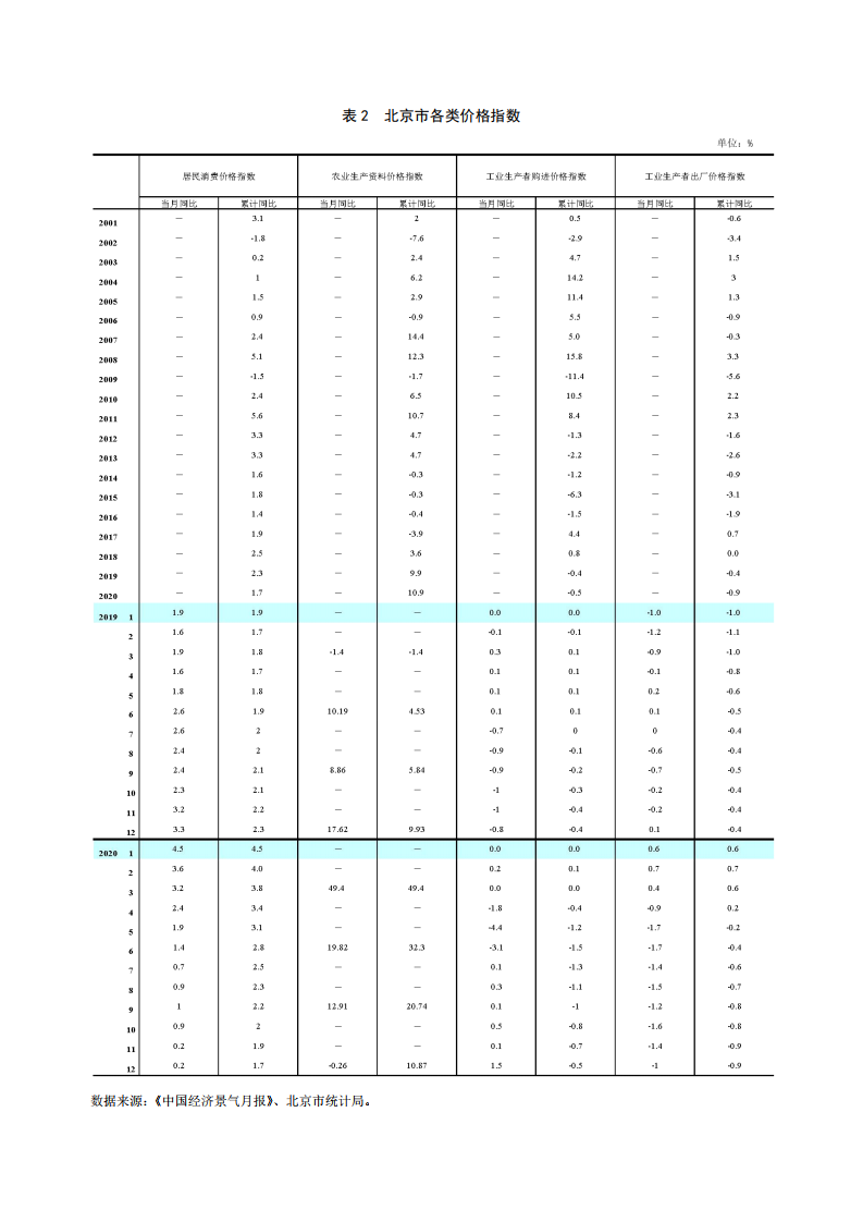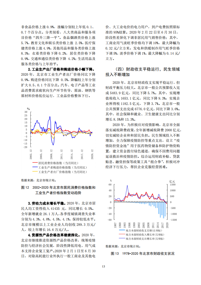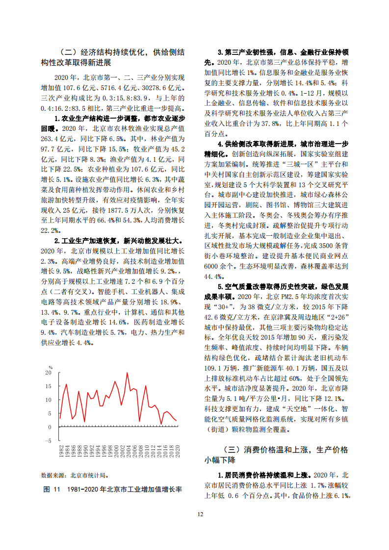 三次产业构成比为0.3:15.8:83.9,服务业优势突 显;都市农业逐步回暖,休闲农业和乡村旅游人均消费增长22.2%;工业生产加 速恢复,重点行业中计算机、通信和其他电子设备制造业、医药制造业较快增长, 同比分别增长14.6%、9.4%;第三产业韧性增强,信息、金融行业发挥主要带动 作用,分别增长14.4%和5.4%。三是消费价格温和上涨,生产价格小幅下降。北 京市居民消费价格同比上涨1.7%;工业生产者出厂价格、购进价格同比分别下降 0.9%和0.5%。四是财政收支平稳运行,民生投入不断增加。全市完成一般公共预 算收入5483.9亿元,同比下降5.7%;一般公共预算支出6776.0亿元,同比下降 3.6%。社会保障和就业、卫生健康支出同比分别增长8.5%和13.3%,全年新增减 税降费2000亿元。五是高端产业显现韧性,发展质效不断提升。高技术产业和战 略性新兴产业增加值占GDP的比重达25.6%和24.8%(二者有交叉),其中,高技术 制造业增加值同比增长9.5%,实现利润531.3亿元,同比增长5.4%,占全市规模 以上工业企业利润29.8%;战略性新兴产业增加值同比增长9.2%。