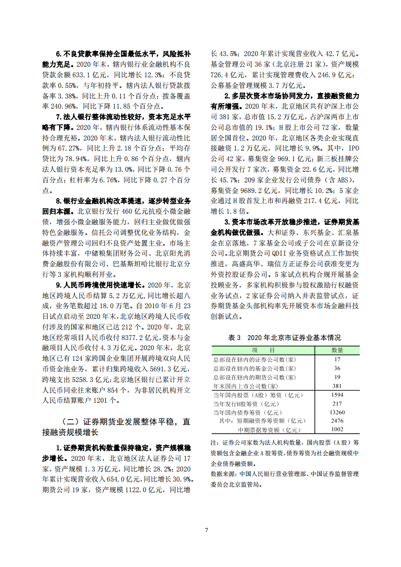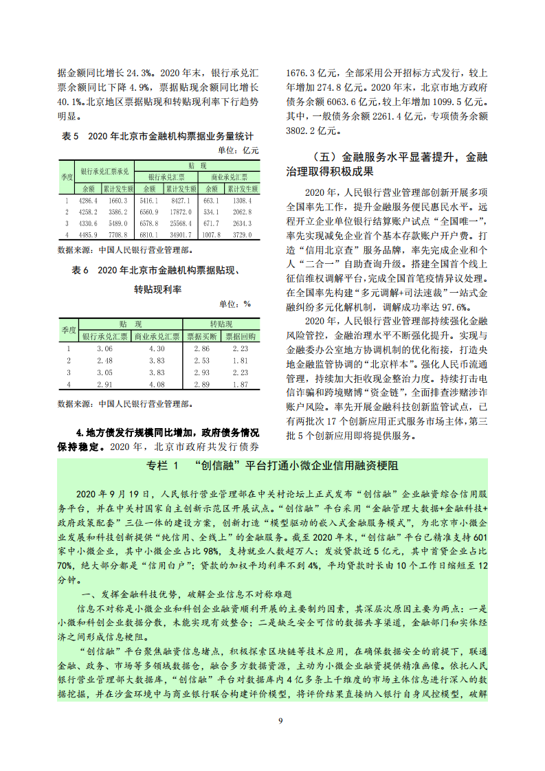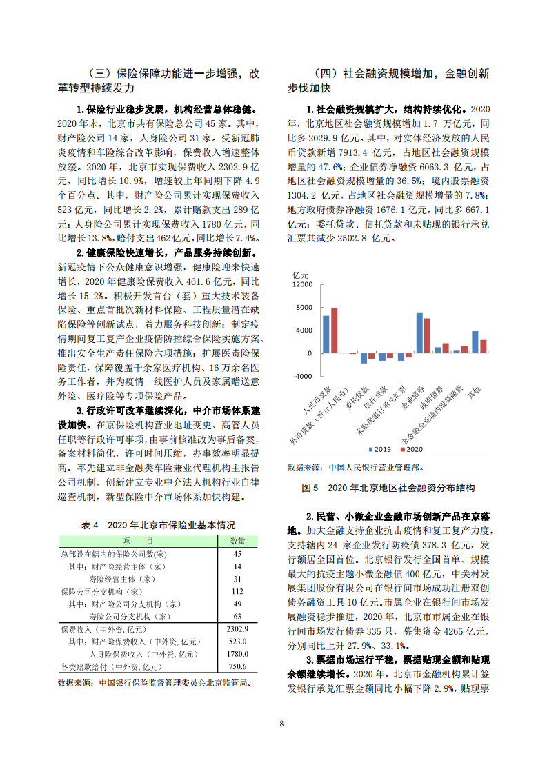 三是保险保障功能进一步增强,改革转型持续发力。实现保费收入2302.9 亿元,同比增长10.9%;其中,财产险实现保费收入523亿元,同比增长2.2%;人 身险实现保费收入1780亿元,同比增长13.8%。四是社会融资规模增加,金融创 新步伐加快。北京地区社会融资规模增加1.7万亿元,同比多2029.9亿元;发行 防疫债378.3亿元,居全国首位;发行全国首单、规模最大的抗疫主题小微金融 债400亿元。五是金融服务水平显著提升,金融治理取得积极成果。率先推进远 程开立企业单位银行结算账户试点,率先实现减免企业首个基本存款账户开户 费;打造“信用北京查”服务品牌,率先完成企业和个人“二合一”自助查询升 级;率先开展金融科技创新监管试点,已有两批次17个创新应用正式服务市场主 体。六是金融业改革开放实现重大突破,重点产业领域金融建设稳步推进。持续 推进国家服务业扩大开放综合示范区和中国(北京)自由贸易试验区建设,实现 跨境贸易和投融资便利化、本外币合一银行结算账户体系试点等23项试点政策落 地;助力第二家外资独资信用评级机构惠誉博华落户北京;支持外资投资机构参 与合格境内有限合伙人(QDLP)境外投资试点;积极推动中关村科创金融试验区 申创工作和国家文化与金融合作示范区建设。