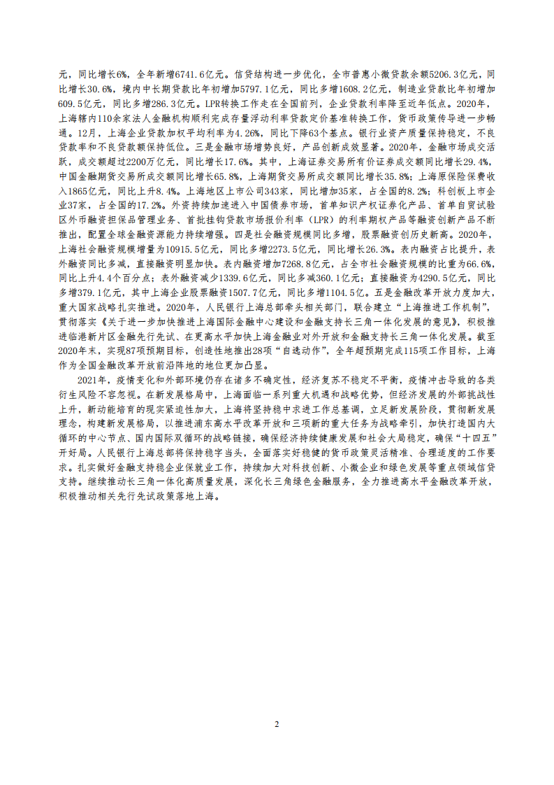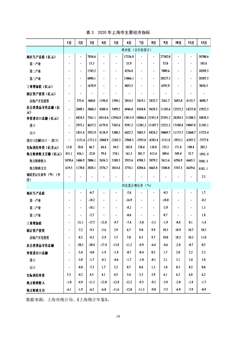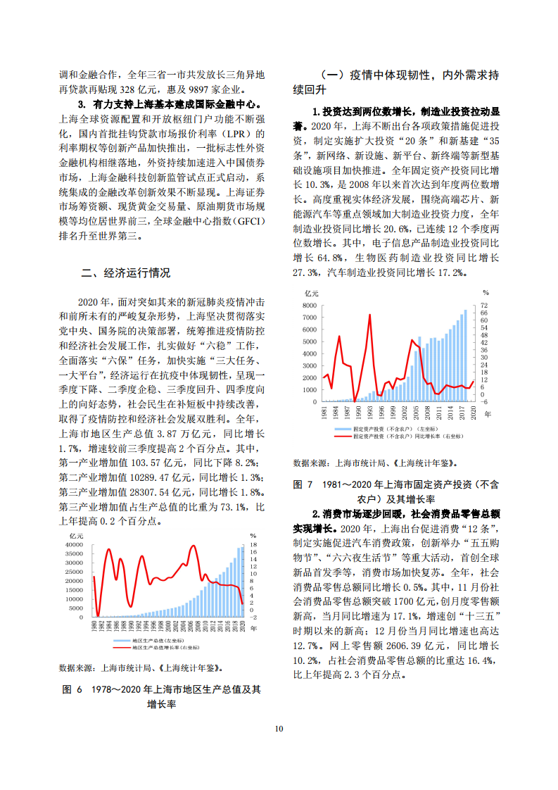 2020年,面对新冠肺炎疫情巨大冲击和复杂严峻的国内外环境,上海市认真 贯彻落实党中央、国务院决策部署,统筹推进疫情防控和经济社会发展,全市经 济运行在抗疫中体现韧性,全年地区生产总值3.87万亿元,同比增长1.7%。居民 收入增速回升,就业形势总体稳定,社会民生在补短板中持续改善,取得了疫情 防控和经济社会发展双胜利。