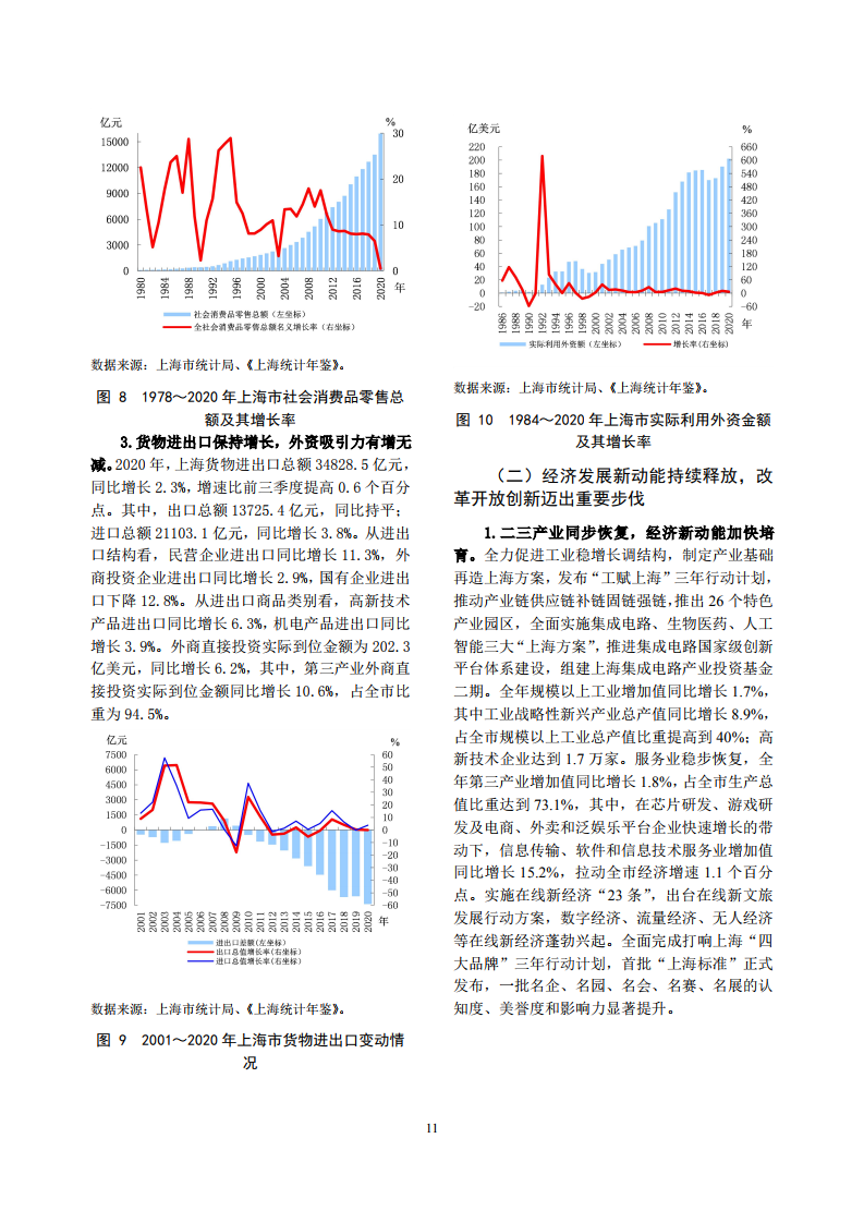 一是供给侧加快恢复,经济发 展新动能持续释放。二三产业同步恢复,全力促进工业稳增长调结构,制定产业 基础再造上海方案,发布“工赋上海”三年行动计划,推动产业链供应链“补链 固链强链”,全面实施集成电路、生物医药、人工智能三大“上海方案”。工业战 略性新兴产业总产值全年同比增长8.9%,占全市规模以上工业总产值比重提高到 40%,高新技术企业达到1.7万家。实施在线新经济“23条”,出台在线新文旅发 展行动方案,数字经济、流量经济、无人经济等在线新经济蓬勃兴起。全年第三 产业增加值同比增长1.8%,占全市生产总值比重达到73.1%,同比提高0.2个百分 点。