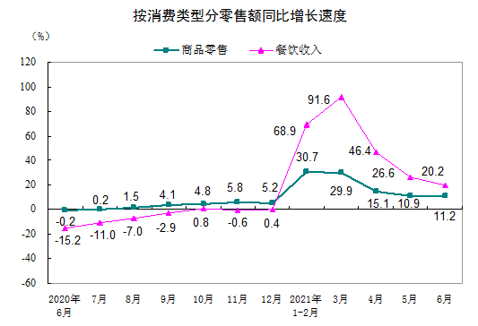 按消费类型分,6 月份,商品零售 33663 亿元,同比增长 11.2%,两年平均增长 5.4%;餐饮收入 3923 亿元,增长 20.2%,两年平均增长 1.0%。1—6 月份,商品零售 190192 亿元,同比增长 20.6%,两年平均增长 4.9%;餐饮收入 21712 亿元,增长 48.6%,规模与 2019 年 1-6 月基本持平。