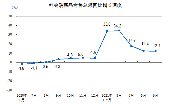 6 月份,社会消费品零售总额 37586 亿元,同比增长 12.1%;比 2019 年 6 月份增长 10.0%,两年平均增速为 4.9%。其中,除汽车以外的消费品零售额 33719 亿元,增长 13.1%。扣除价格因素,2021 年 6 月份社会消费品零售总额实际增长 9.8%,两年平均增长 3.2%。从环比看,6 月份社会消费品零售总额增长 0.7%。