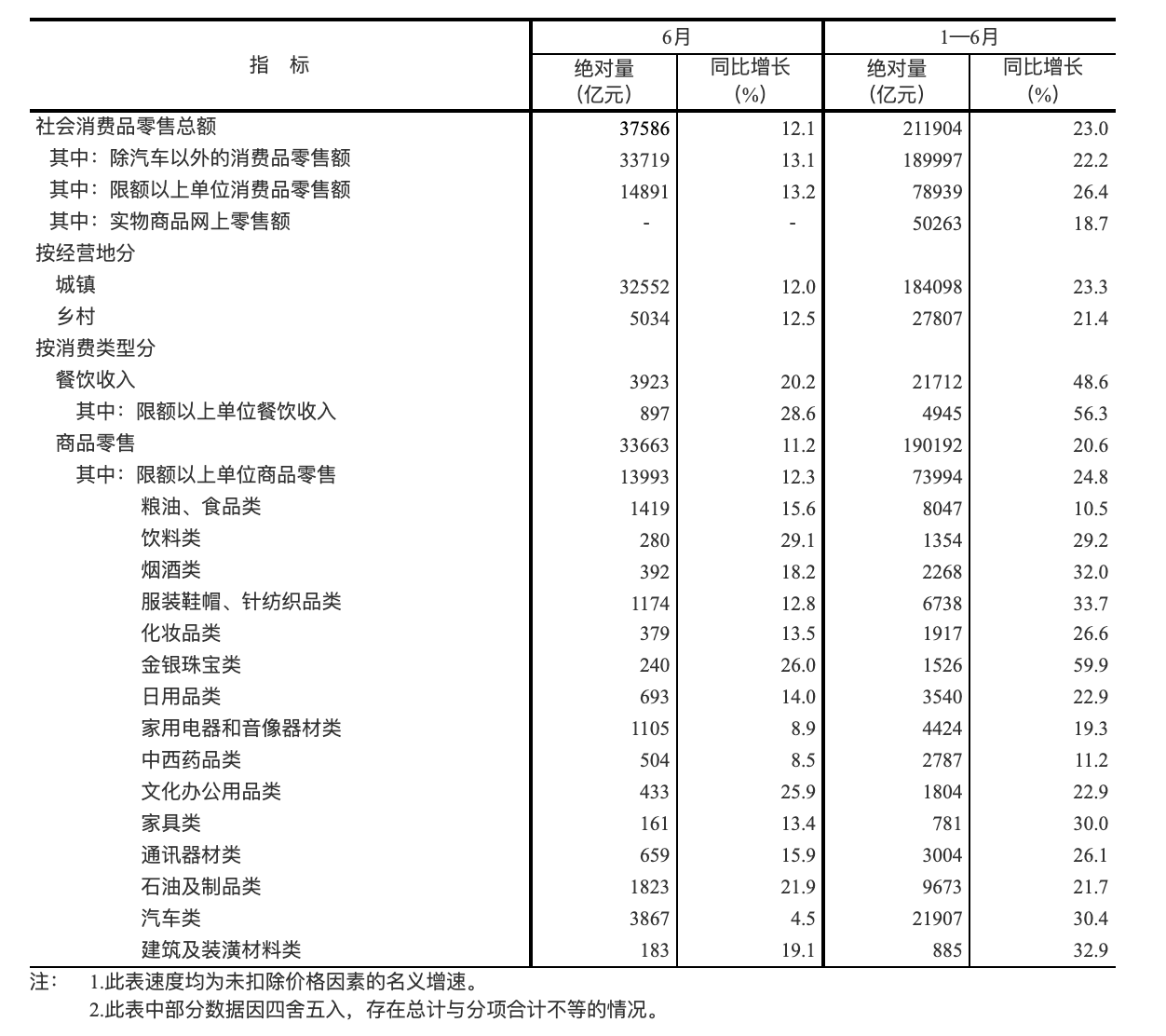按经营单位所在地分,6 月份,城镇消费品零售额 32552 亿元,同比增长 12.0%,两年平均增长 4.8%;乡村消费品零售额 5034 亿元,增长 12.5%,两年平均增长 5.5%。1—6 月份,城镇消费品零售额 184098 亿元,同比增长 23.3%,两年平均增长 4.4%;乡村消费品零售额 27807 亿元,增长 21.4%,两年平均增长 4.0%。