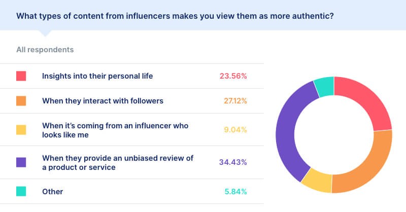 - 通过评论影响购买决策:大多数受访者(38%)表示,评论是最有帮助的社交媒体内容。大多数人(34%)也表示,无偏见的评论是意见领袖赢得信任的最佳方式。