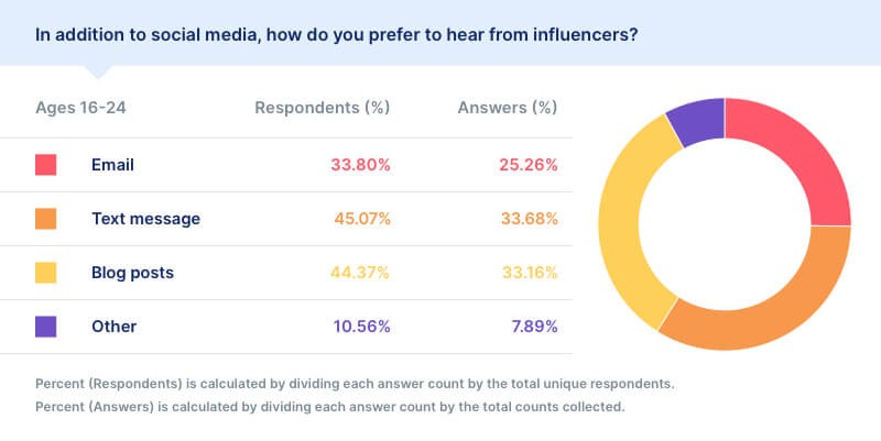 - 掌控对话:当营销人员努力获得他们联系人的直接所有权时,发短信正在成为一种流行的选择。大多数Z世代(45.07%)表示,短信是他们首选的与社交媒体以外的意见领袖交流的方式。千禧一代认为博客是他们的首选,而婴儿潮一代则认为电子邮件是最好的选择。