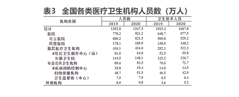 2020年末卫生人员机构分布:医院811.2万人(占60.2%),基层医疗卫生机构434.0万人(占32.2%),专业公共卫生机构92.5万人(占6.9%)(见表3)。