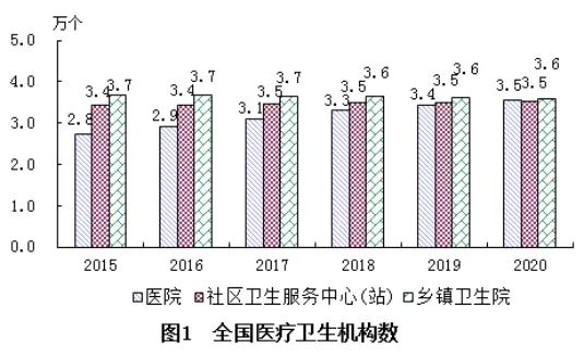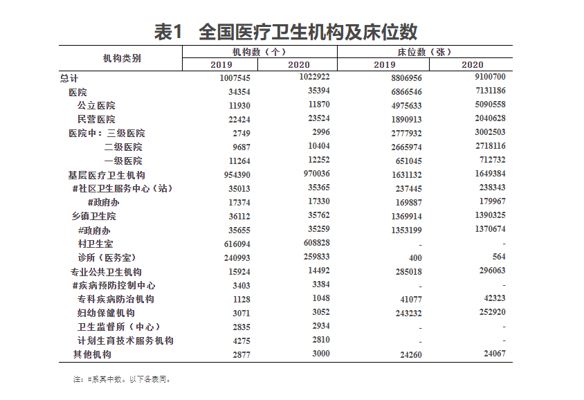 (一)医疗卫生机构总数。2020年末,全国医疗卫生机构总数达1022922个,比上年增加15377个。其中:医院35394个,基层医疗卫生机构970036个,专业公共卫生机构14492个。与上年相比,医院增加1040个,基层医疗卫生机构增加15646个(见表1)。