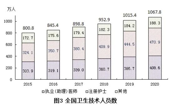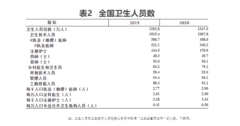 2020年末卫生人员总数中,卫生技术人员1067.8万人,乡村医生和卫生员79.2万人,其他技术人员53.0万人,管理人员56.1万人,工勤技能人员91.1万人。卫生技术人员中,执业(助理)医师408.6万人,注册护士470.9万人。与上年比较,卫生技术人员增加52.4万人(增长5.2%)(见表2)。