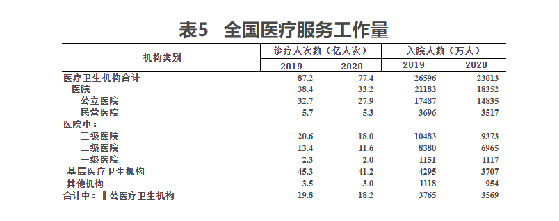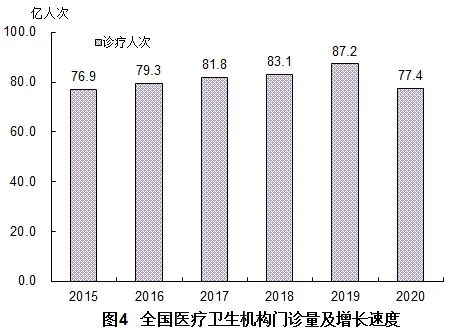 (一)门诊和住院量。2020年,全国医疗卫生机构总诊疗人次达77.4亿人次,比上年减少9.8亿人次(下降11.2%)。2020年居民到医疗卫生机构平均就诊5.5次。