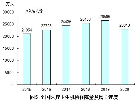 2020年入院人数中,医院18352万人(占79.7%),基层医疗卫生机构3707万人(占16.1%),其他医疗机构954万人(占4.1%)。与上年比较,医院入院减少2831万人,基层医疗卫生机构入院减少588万人,其他医疗机构入院减少164万人。