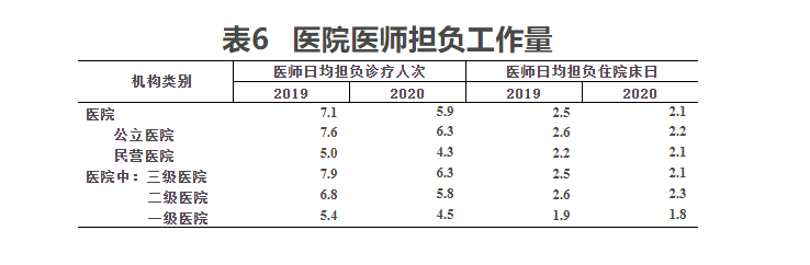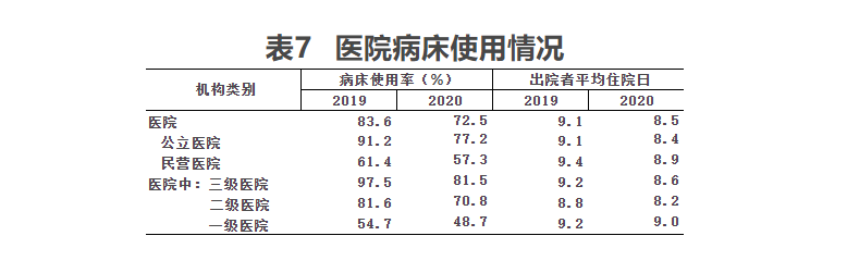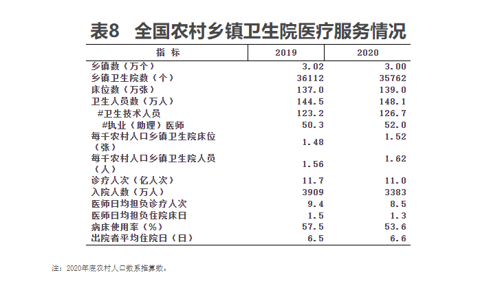 2020年,乡镇卫生院诊疗人次为11.0亿人次,比上年减少0.7亿人次;入院人数3383万人,比上年减少526万人。2020年,医师日均担负诊疗8.5人次和住院1.3床日。病床使用率53.6%,出院者平均住院日6.6日。与上年相比,乡镇卫生院医师日均担负诊疗和日均担负住院床日分别减少0.9人次和0.2床日,病床使用率下降3.9个百分点,平均住院日比上年延长0.1日。