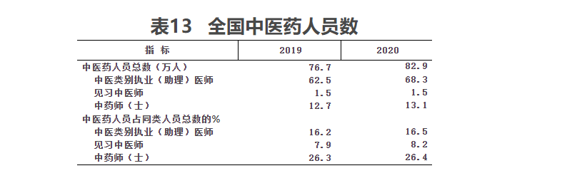 (一)中医类机构、床位及人员数。2020年末,全国中医类医疗卫生机构总数达72355个,比上年增加6546个。其中:中医类医院5482个,中医类门诊部、诊所66830个,中医类研究机构43个。与上年比较,中医类医院增加250个,中医类门诊部及诊所增加6295个(见表11)。